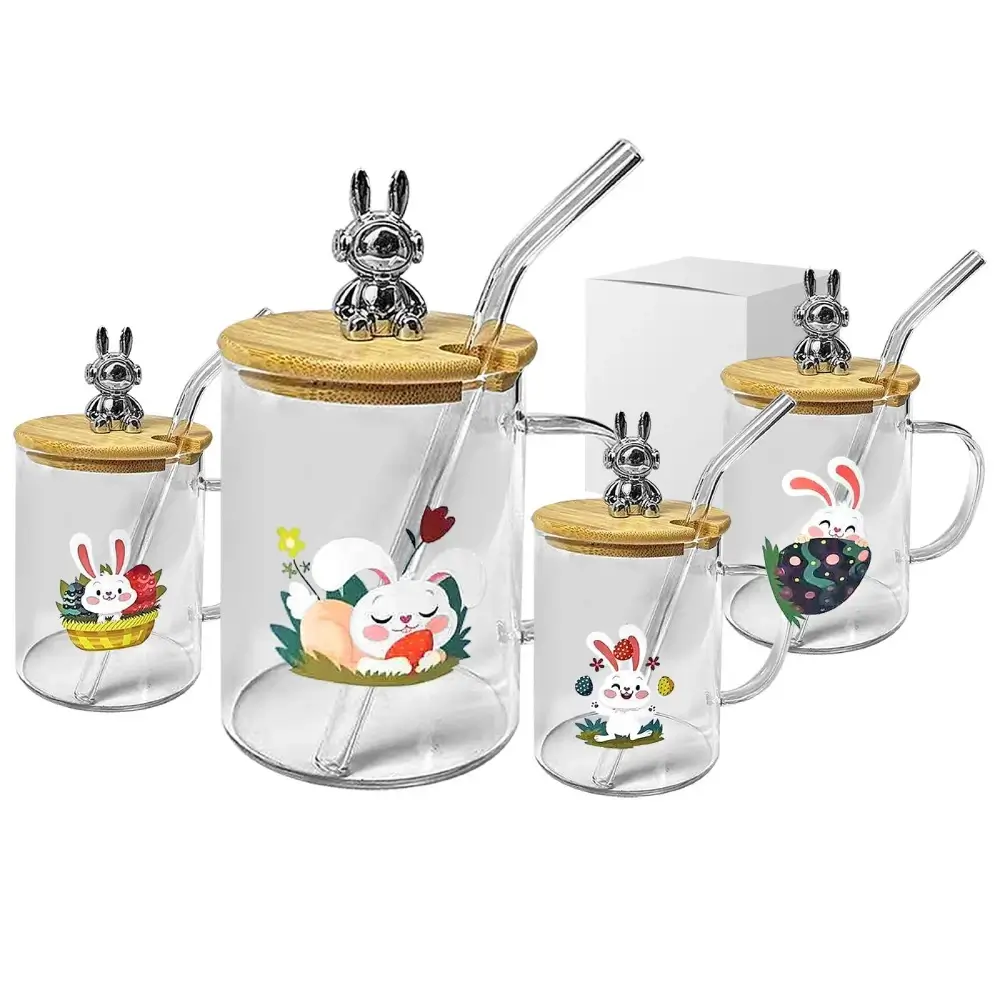 Κούπα με Καλαμάκι Γυάλινη Κλείνει με Ξύλο Happy Rabbit, 10x8cm, 400ml, Bunny’s